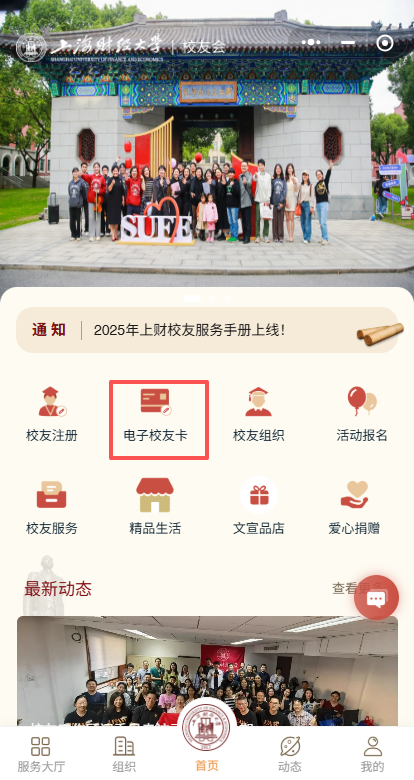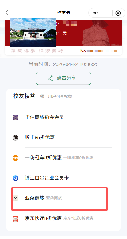 2.在“首页”点击“电子校友卡”,注册领取后点击“亚朵商旅”,授权开通即可领取会员权益。